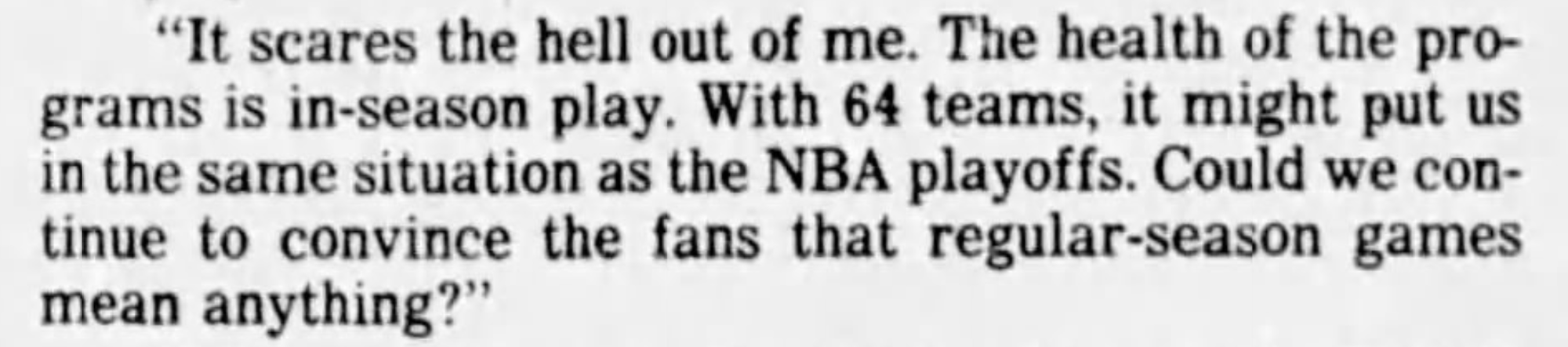 This is not meant to point that people in the past were always wrong. That would be the wrong way to look at essentially anything in life, even if, in the specific case of NCAA Tournament expansion, they were obviously wrong. It's meant to point out that every single decade, sometimes several times a decade, college basketball has faced threats framed as terminal to the sport. Writers did not say "this will change college basketball for the worse." They were more dramatic in saying that the sport would end.