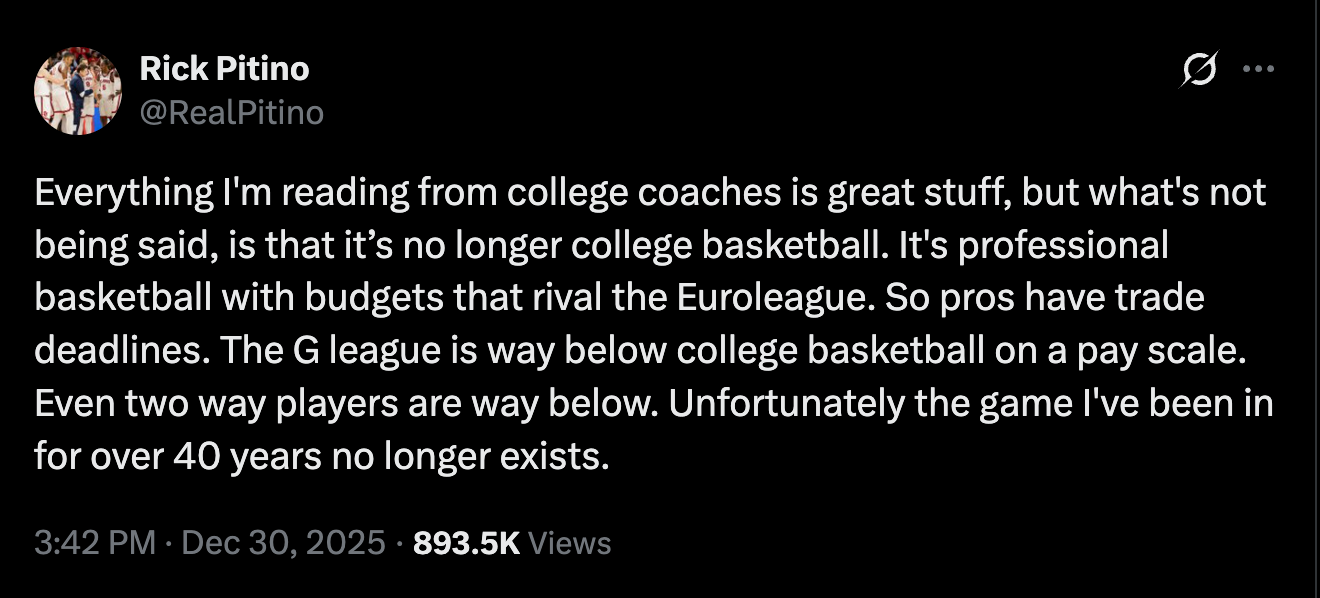 The common thread of all these complaints, whether the subject is saying it directly or not, is nostalgia for how things were. The belief, any time a perceived threat is afoot, is that college basketball was once in its correct, natural, morally coherent, and perfect form, which just so happened to be when I was a teenager getting into the sport, and we are currently drifting away from that pure thing. This could be and has been centered around any hot-button issue of its time, whether that was nationalized recruiting, a shot clock, the one-and-done era, or our current transfer portal situation where the average roster in 2025-26 contains just 25% of its minutes from the previous season.