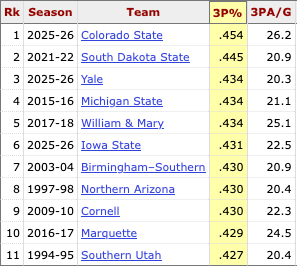 There are currently 11 teams that fit the criteria of shooting 42.5% from three as a team, while taking at least 20 a game. Colorado State, Yale, and Iowa State are all making the list for this current season, so that means only 8 teams have ever done it before.