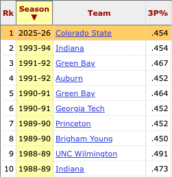 No team has accomplished this feat since Indiana did it in the 1993-94 season. Indiana took 401 3s for the entire season, coming out to 13.4 a game. Colorado State has already taken 262 through their first 10 games.
