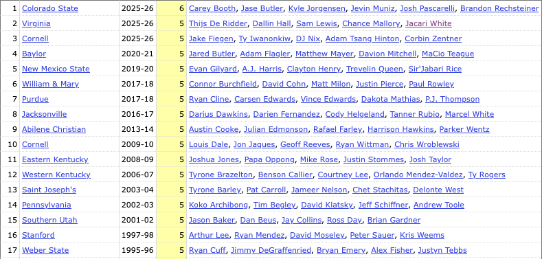 Colorado State currently has 6 players who are shooting over 38% from three on at least 2.5 attempts per game. They would be the first team in history to have 6 players accomplish this (although it's worth noting that Cornell this season just barely misses this cutoff). The math probably says that not all 6 of these players will be meeting this requirement by season end, but it shows the depth that Colorado State has with shooting the ball.
