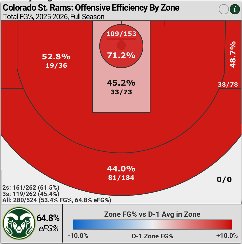 Above is the shooting chart for Colorado State this season, and this sums up why this offense is so elite. Yes, the Rams are the best shooting team in the country on incredible volume, but they aren't a one trick pony. They have enough balance within their offensive system to try and punish teams in different ways.
