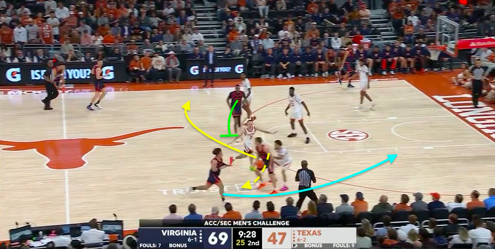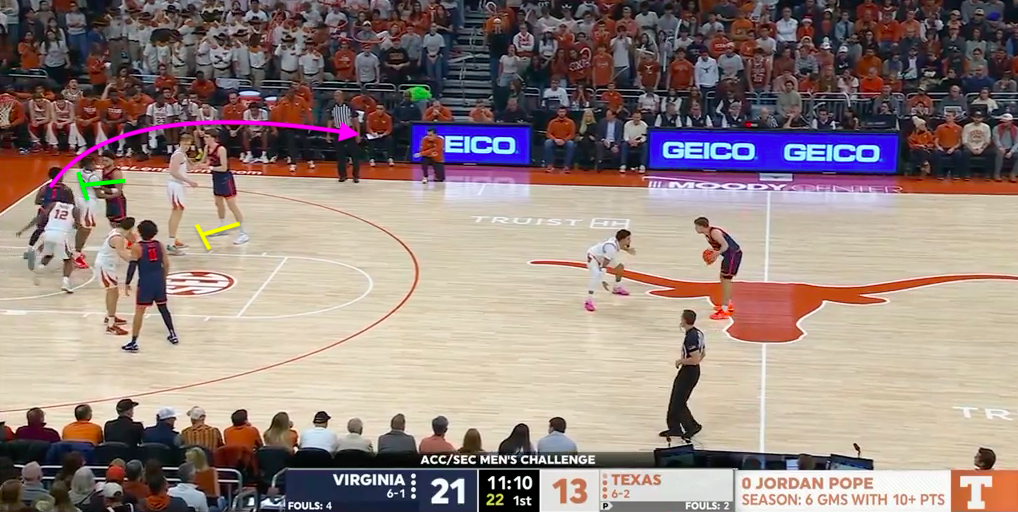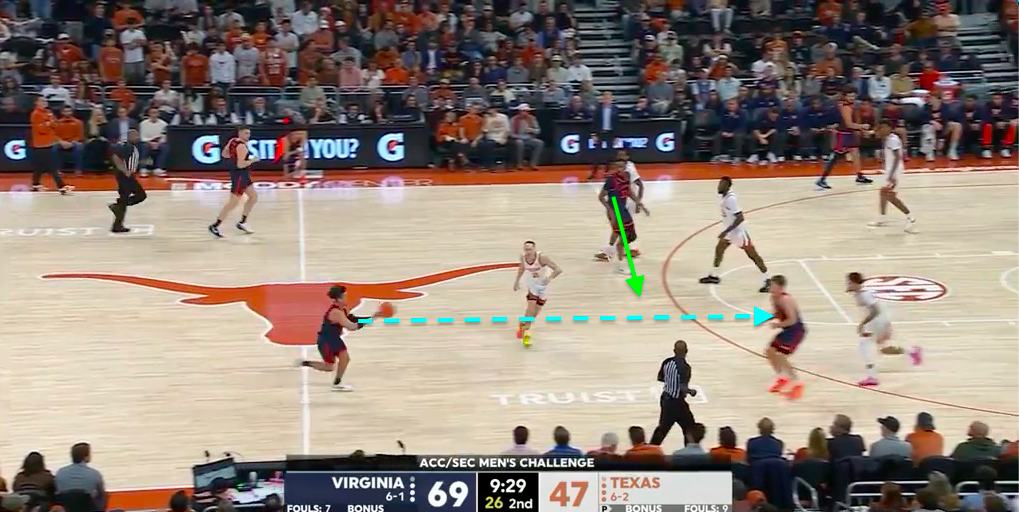 The foundation of Virginia’s Pistol series starts with one of the guards advancing the ball, a second guard spaced on the wing and the 5 positioned in the middle third of the floor. The ball handler triggers the action by passing ahead to the wing — something Mallory does here against Texas, hitting Hall — while Onyenso fills the middle at the top of the key.