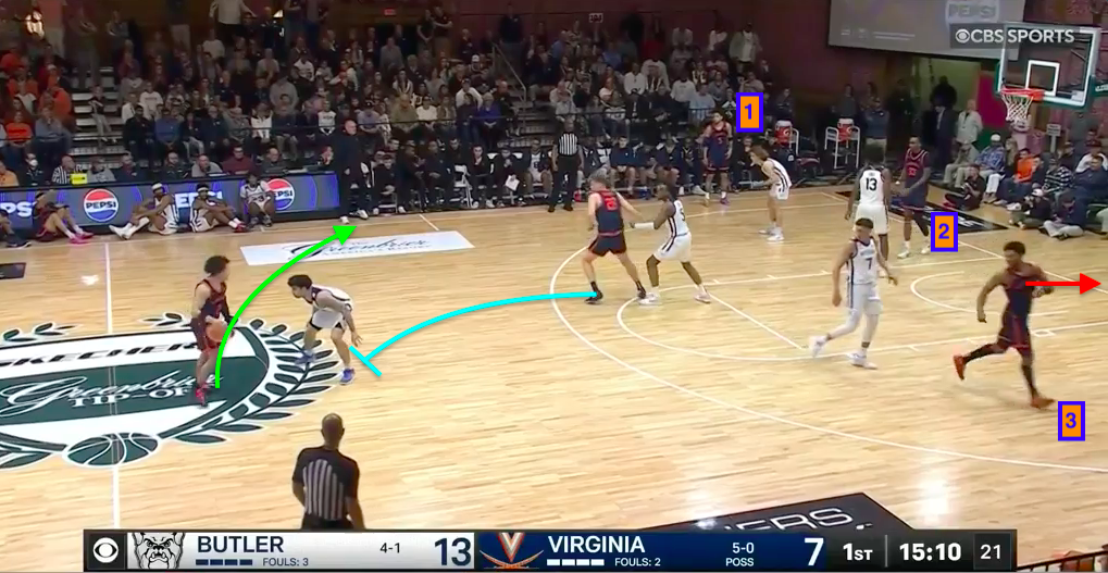 Virginia can also create different looks and shapes off the initial Floppy set. In the second half against Butler, White comes off staggered screens from Hall and Onyenso, followed by Hall lifting off a single down screen from Tillis. Instead of moving to the high post, Tillis sets a screen and seals in the mid-post for an isolated touch.
