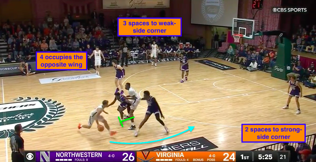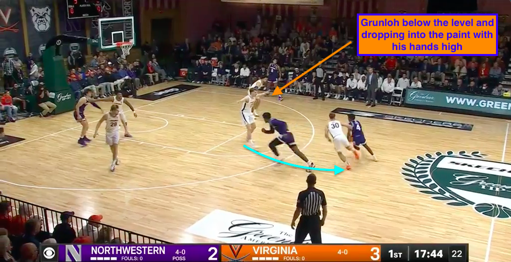 On this possession, Virginia runs a 3 Across pick-and-pop action with Thomas and De Ridder against Northwestern. The play flows into a 4-5 pick-and-roll with De Ridder and Grunloh. Northwestern switches the action, with Page guarding De Ridder, who puts the ball on the deck and attacks downhill. The initial shot misses, but Virginia’s bigs crash the glass, and Grunloh taps it back in for 2.
