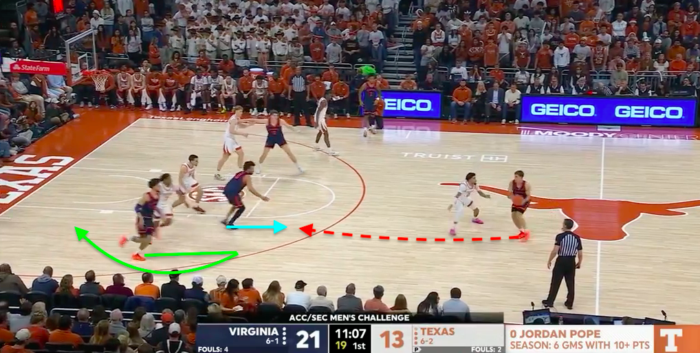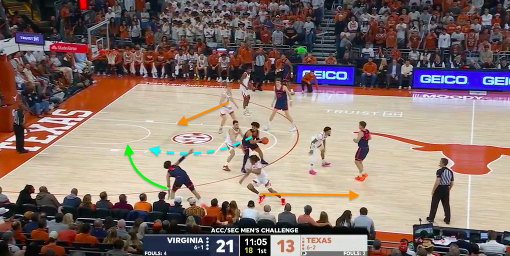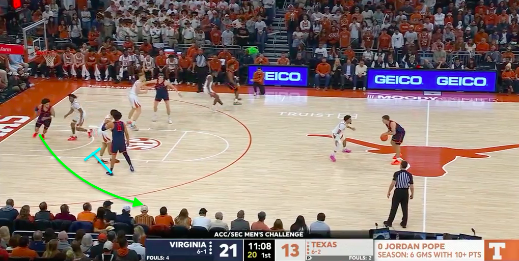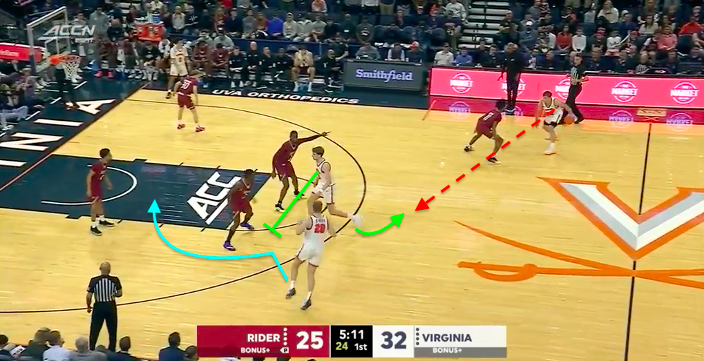 UVA has run this action with De Ridder and Grunloh as the screener, with one key caveat: De Ridder will usually reject the screen and cut down the lane. From there, the point guard (Hall) swings the ball to Grunloh at the top of the arc.