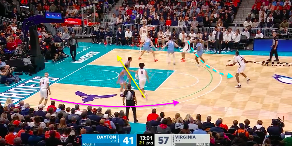 Here, Mallory and Onyenso run an angled pick-and-pop here against Dayton. The Flyers initially double the ball, but eventually switch the action, placing the 7-foot-1 Amael L'Etang on Mallory. Still, Onyenso is able to catch in space on the pop, allowing Virginia to flow into its 5-out offense. The pop prompts a 45-degree cut from Tillis, followed by White lifting from the left corner to run a pitch-and-chase pick-and-roll with Onyenso.