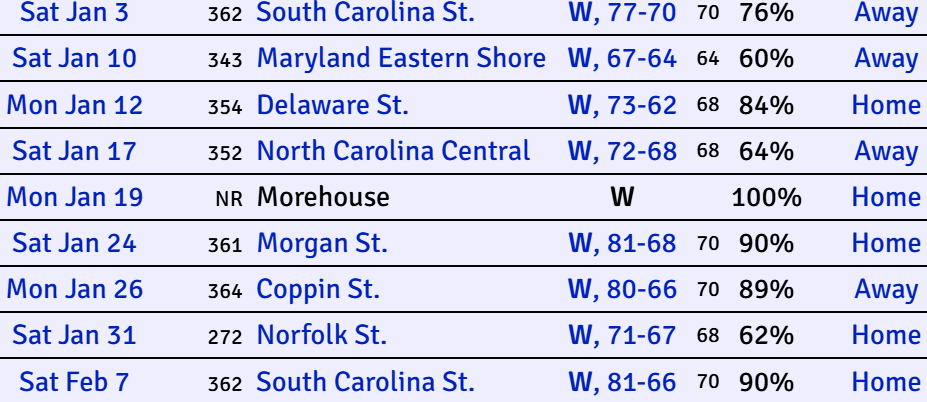 Howard is the lone MEAC squad with a winning record, sitting at 9-6 overall. The Bison have been the conference's brightest spot, going 5-1 in their last six games with the only setback coming on the road to Northwestern. Over the past three weeks, Howard notched impressive wins over fellow HBCUs North Carolina A&T and Hampton, plus a notable road victory at UNCW which is not an easy place to win.