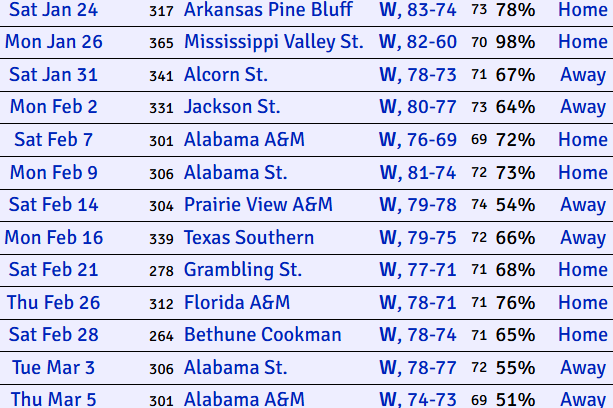 Southern’s identity remains clear, elite defense. They boast the best defensive efficiency in the SWAC, though offensive efficiency lags behind at 10th in the league. Despite that imbalance, projections remain favorable, with a 68% chance to win their remaining 13 games and win probability of 65% or higher in eight of those contests. Their national profile has also ticked upward, improving from 265 to 253 in KenPom.