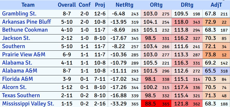 The bottom of the standings remains competitive despite recent struggles. Florida A&M has lost four straight games but has played only once in conference action, narrowly falling at Bethune-Cookman. The Rattlers haven’t played at home since December 17th, their last win, yet still improved their KenPom rating. Alcorn State, now on a five-game skid, also hasn’t played a home game but moved from 346th to 344th while shooting over 50 percent from three in a close loss at Jackson State.