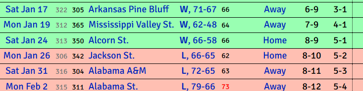 The Tigers had a strong 2-1 week in conference play, improving to 4-4. They won both road contests but dropped the home game to the surging Arkansas Pine Bluff team we discussed earlier. Their road wins were critical, especially the first one against Jackson State who is side by side with them in this middle tier.