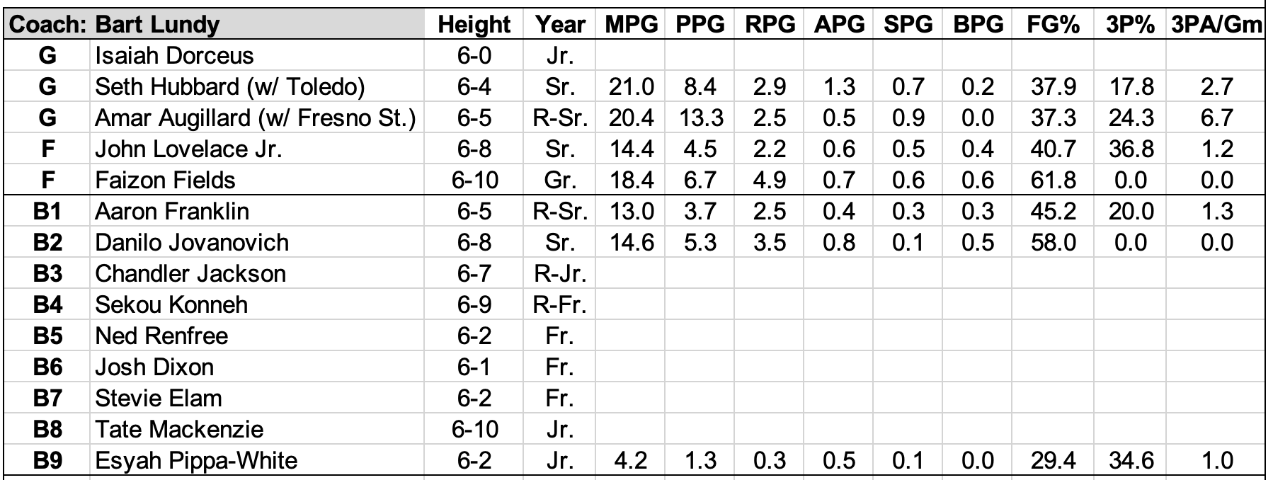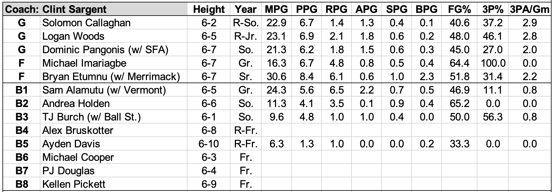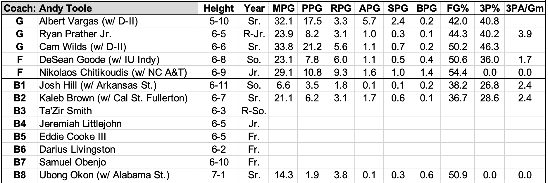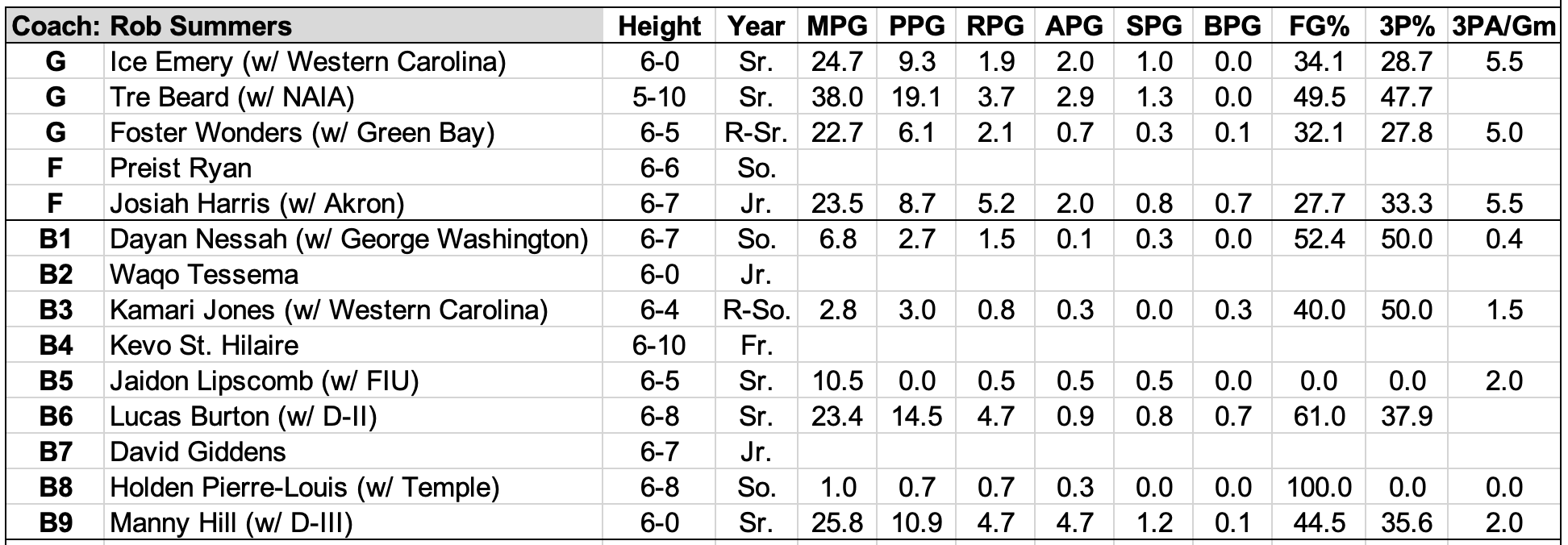 Tre Beard (NAIA) and Manny Hill (D-III), along with three JUCO newcomers - David Giddens, Waqo Tessema and Priest Ryan - will also toss their hat in the ring for minutes right away. Beard and Tessema are two prolific shooters who must be marked on the perimeter, while Hill and Ryan are more downhill attackers. Giddens carries the strongest pedigree of the bunch as an honorable mention JUCO All-American. Summers sees Giddens as one of their best all-around defenders, so look to see him 'size up' and play 4 and even 5 in smaller lineups.
