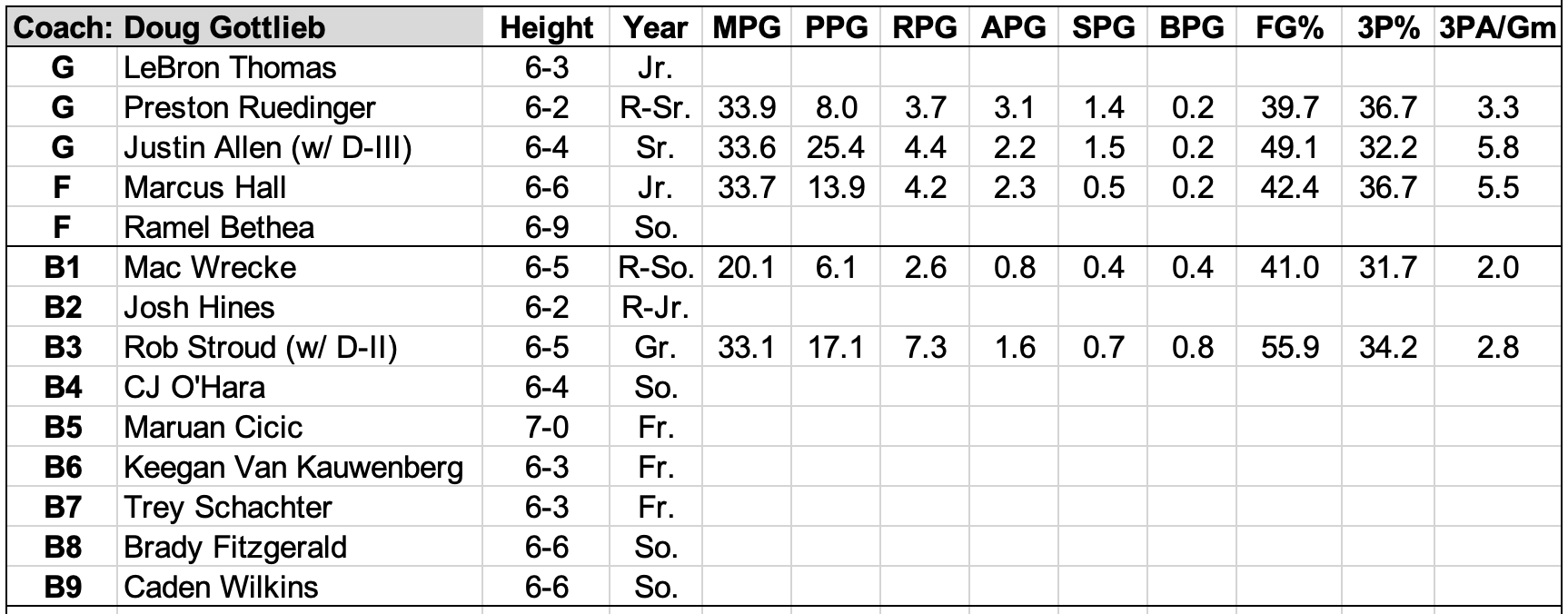 The players Gottlieb retained this summer are intentionally in sync with his revamped vision of an older, more mature, and generally grittier team. The heart and soul of this squad is Preston Ruedinger, a legitimate ‘Rudy’ esque hustler who does a little bit of everything. His motor and smarts are useful, but he's not an alpha dog scorer or high usage shot maker on a winning team.