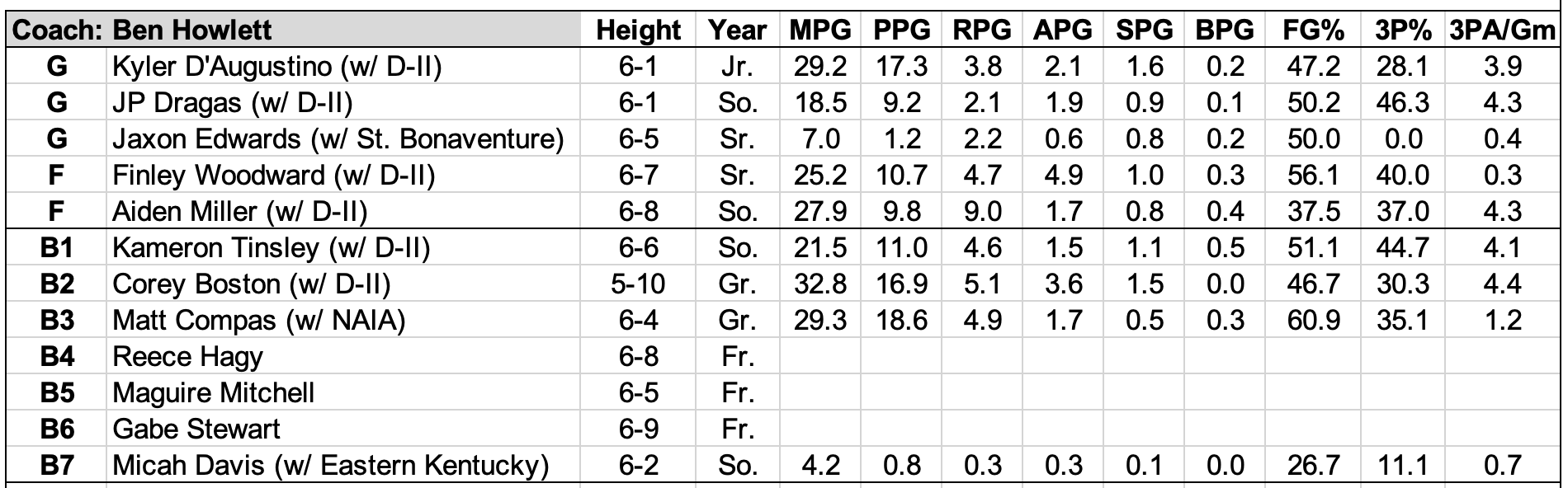 D-II Concord transfer Corey Boston brings a turbo jet gear to this backcourt and should make an instant impact on both sides of the ball. Howlett faced off against Boston numerous times at his prior stop. Expect D'Augustino and Boston to key Howlett's pressure defensively.