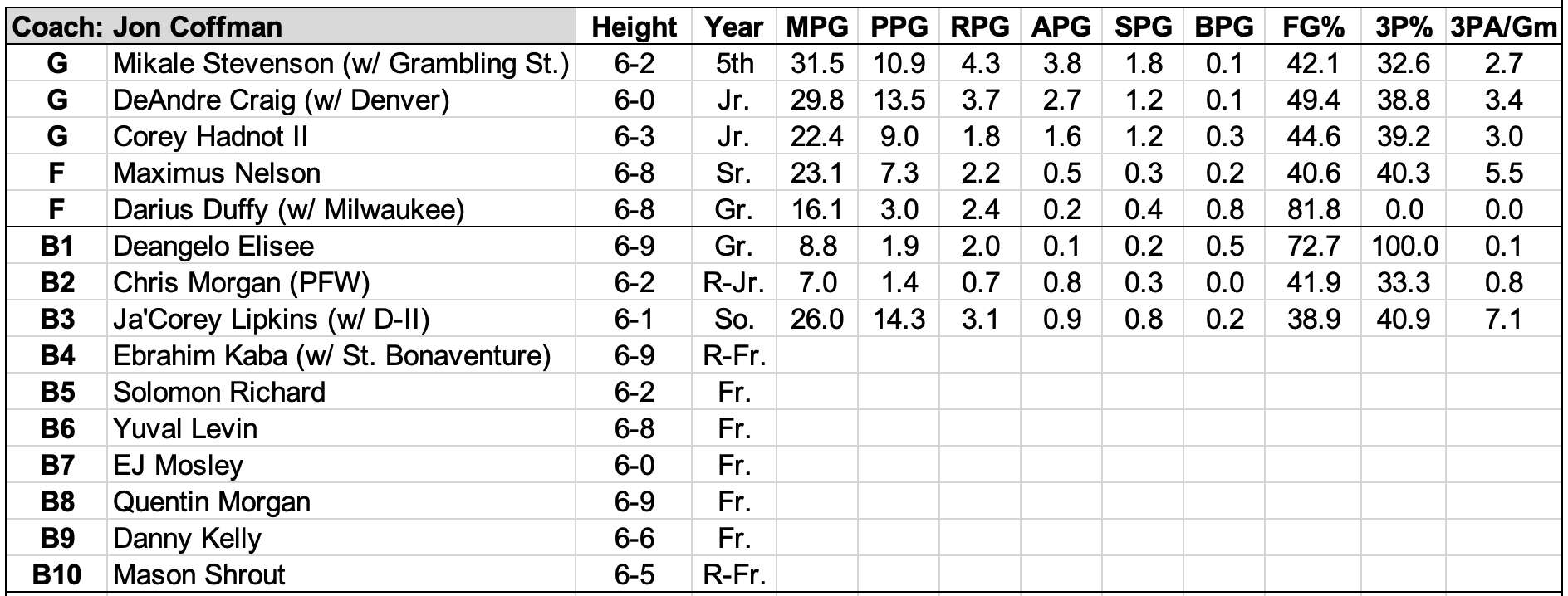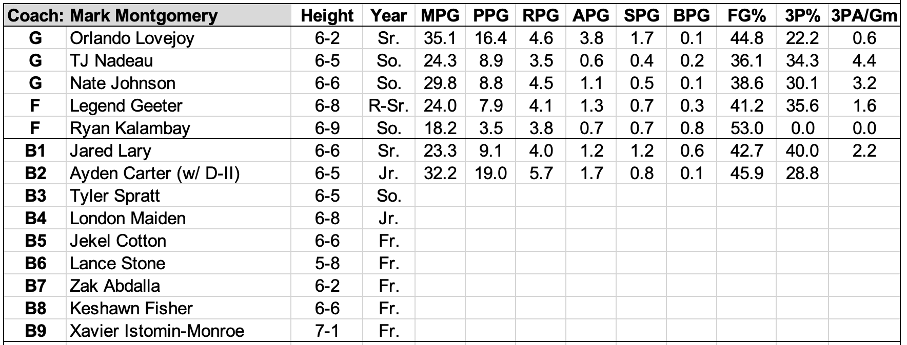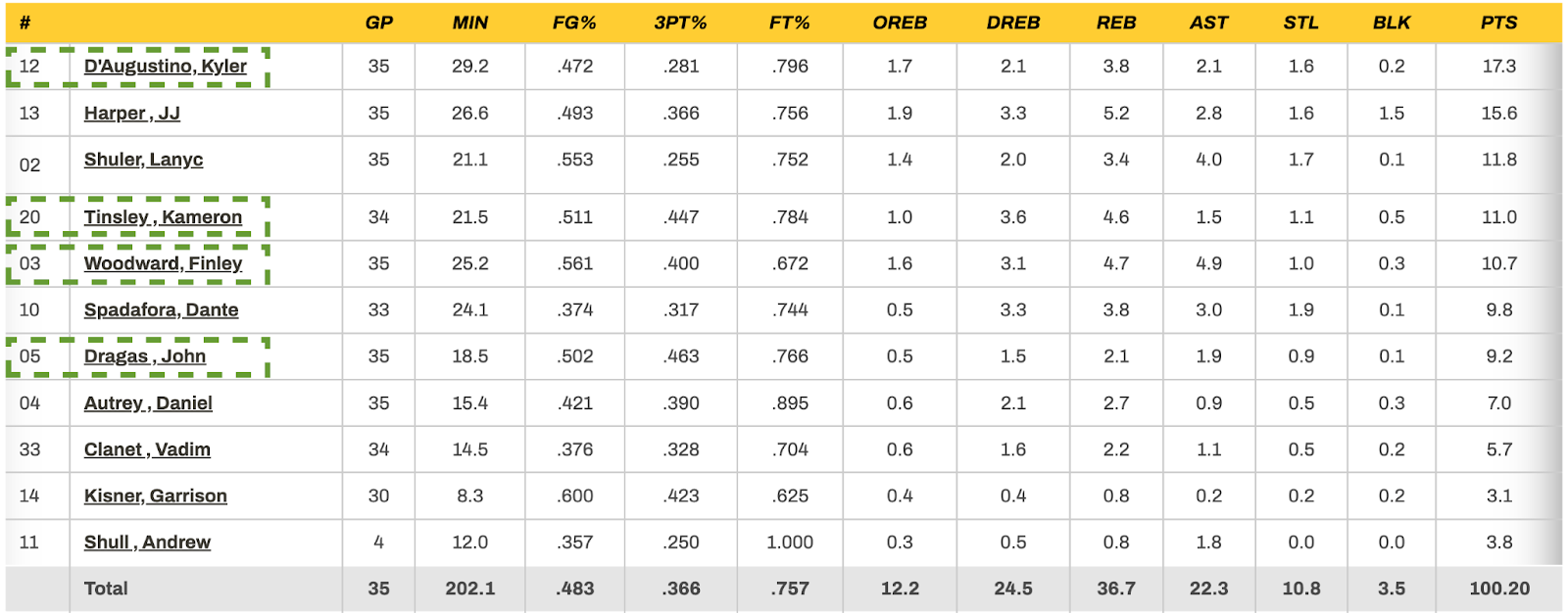 Howlett was wise to attack quick twitch athletes in the portal to supplement his ‘returners’. The screenshot below is West Liberty’s team stat page from a year ago. This contextualizes what Howlett ‘lost’ from his 30-5 team a year ago. Notice that Howlett’s most disruptive defenders all graduated (notably JJ Harper, Lanyc Shuler and Dante Spadafora, not highlighted in green boxes):