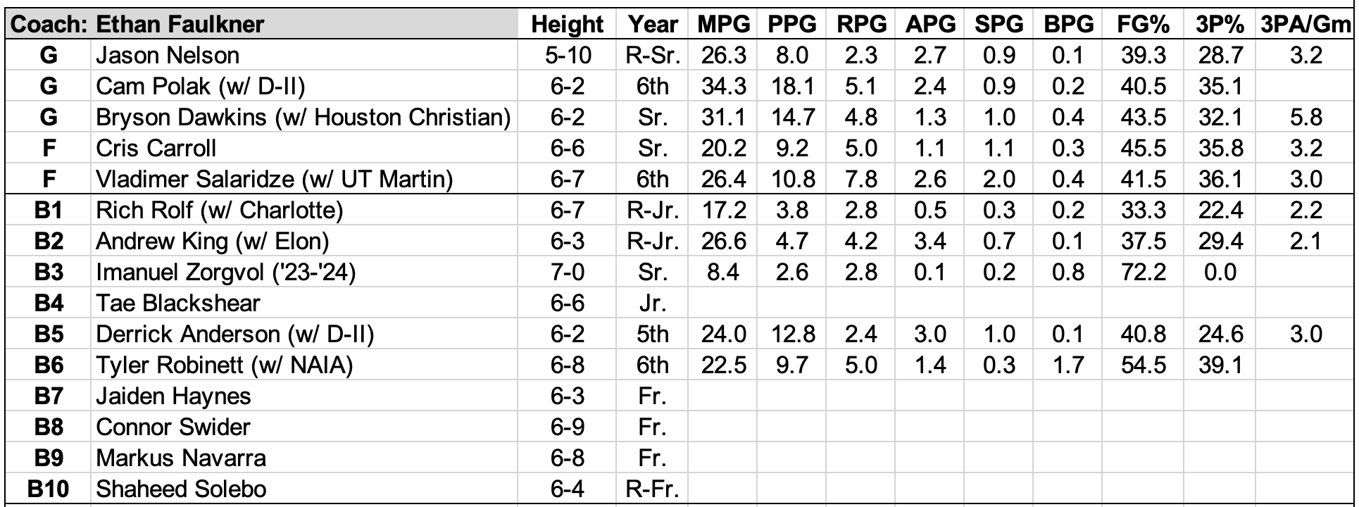 Faulkner clearly bolstered his wing and forward personnel with the additions of Tae Blackshear, Rich Rolf and Vladimer Salaridze. Blackshear was a big time shooter at the JUCO level, and Faulkner is thirsty for a better shooting team this season - thus, he could quickly climb up the rotation depth chart.