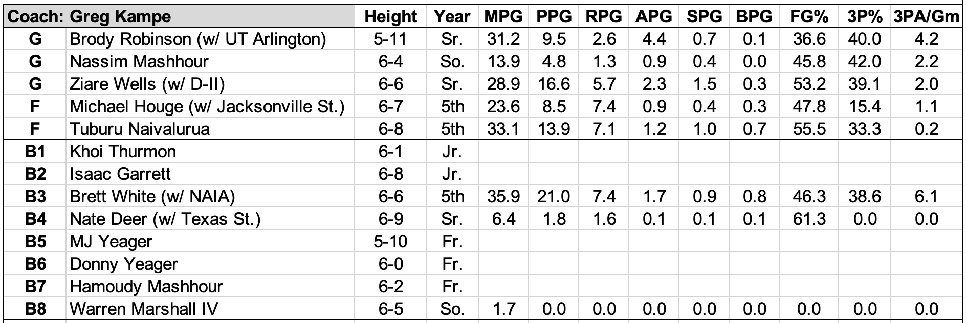 Kampe pursued a point guard he believes is cut from the same cloth as many of his past great floor generals. Brody Robinson was a little erratic in his D-I debut at UT Arlington last year but he might round into a perfect mid major maestro under Kampe. Robinson's a little undersized but fast, smart, and skilled. He loves to push the pace in the open floor, so shooters will need to be shot ready at all times (paging Nassim Mashhour and Brett White).