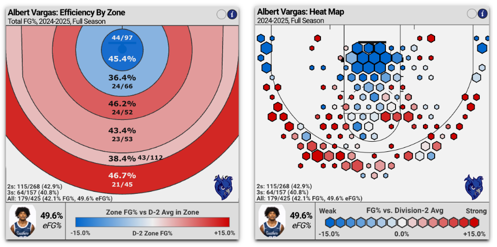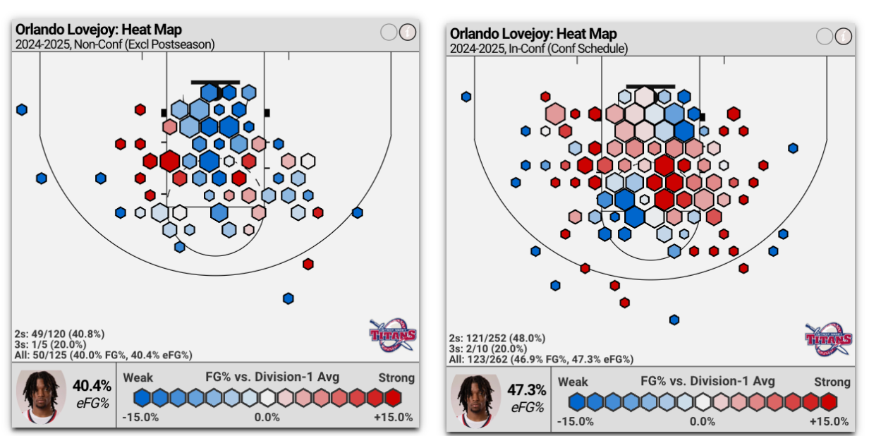 Many devout data dudes will vomit at Lovejoy’s shot chart. At 6-3, he loves to find his comfort zone into the 12-18 feet area and shoot over his defender. He may never be a hyper efficient lead alpha but he graded out in the 66th and 70th percentile in paint and mid range 2-pointers, respectively, per CBBAnalytics.com. It's also worth noting Lovejoy's upward pointing trajectory. He improved demonstrably from the non-conference to conference chapters of the season, as the side by side shot chart breakdown shows below: