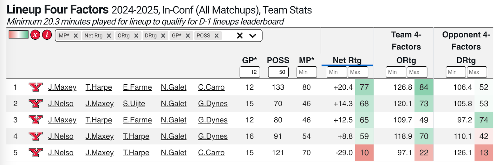 The chart below shows Youngstown’s five most frequently used lineups last year (minimum of 50 possessions or more), which featured a blend of Dynes or Cris Carroll at the 5 position.