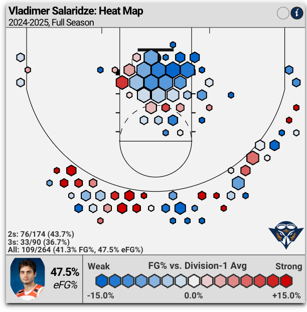 Faulkner had success transforming a similar prototype in Nico Galette, an inefficient low major player who blossomed under Faulkner's tutelage. As alluring as Salaridze's offensive arsenal is, he was not an efficient scorer or finisher around the rim last year: