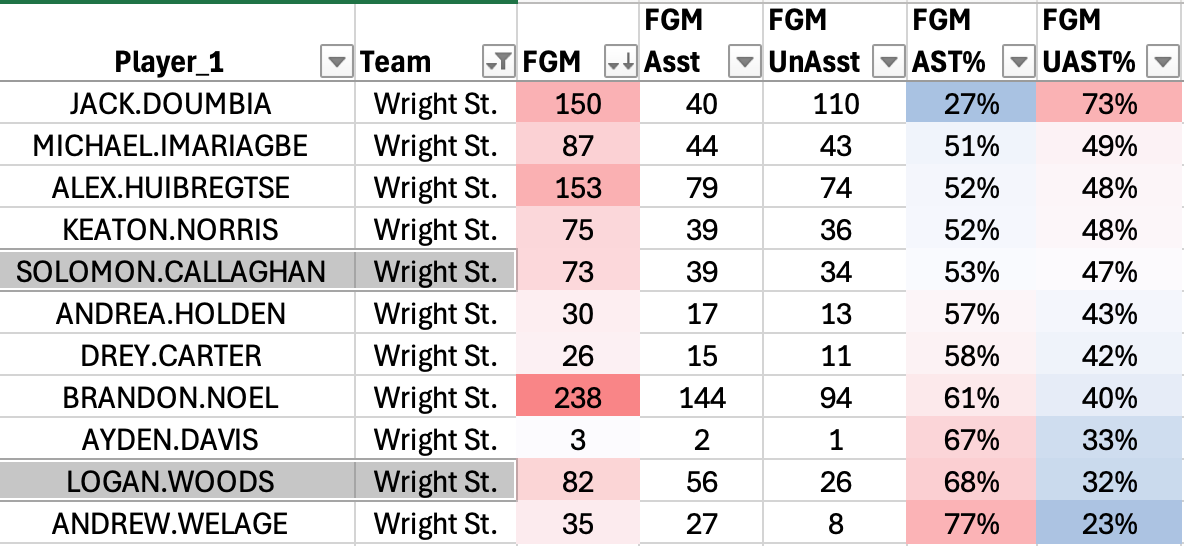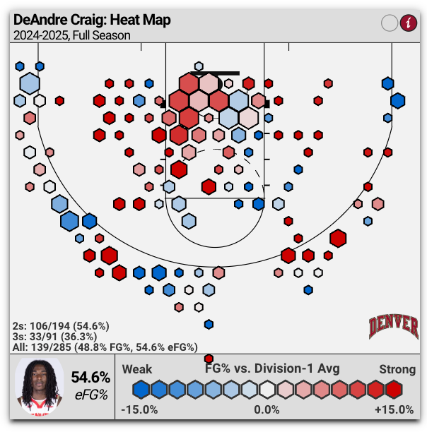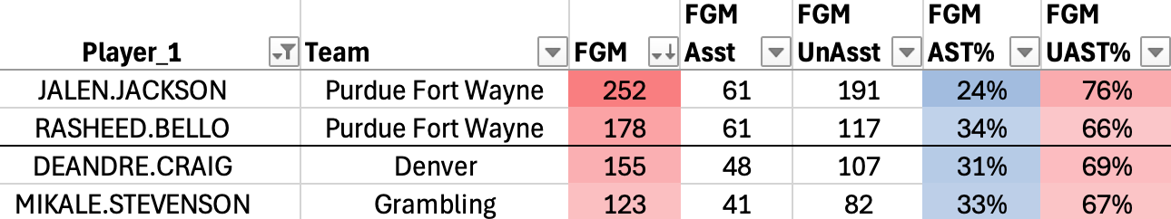 Replicating Jalen Jackson and Rasheed Bello’s efficiency won’t be easy but Coffman is wise to target similar lead guard prototypes in Stevenson and Craig. Per the chart below, this duo generated the majority of their buckets last year on their own (as defined by “FGM UAST%, or percentage of field goals that were unassisted on). For comparison, Jackson and Bello are shown above on the top two lines.