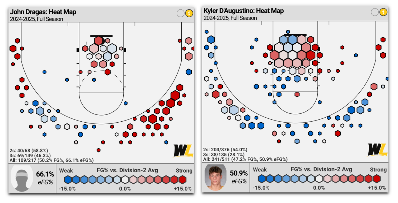 The backcourt tandem of Kyler D'Augustino and JP Dragas form a symbiotic ‘playmaker’ and ‘shooter’ tandem. D'Augustino, the unquestioned engine of this offense, excels at getting to the rim, while Dragas is the one you can’t leave open from the outside. D'Augustino was ice cold from behind the stripe last year but he's clearly a better than 30% gunner from 3-point range.