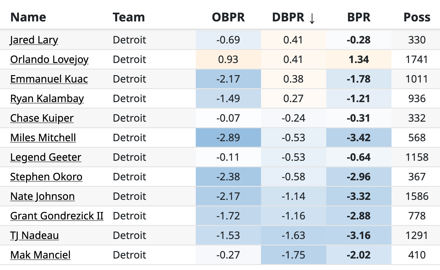 This is where Nadeau’s floor spacing gravity is critical - without him, Detroit could’ve built a mansion with their 3-point bricklaying. He made 36% of his 97 threes in league play, but that still couldn’t offset the rest of his teammates’ atrocious shooting.