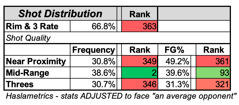 The ShotQuality.com and Haslametrics.com snapshots below are almost unhinged by today’s modern shot diet standards. However, it's hard to fault Detroit's reliance on midrange jumpers given that's the only area they were somewhat comfortable scoring the ball (most of this is driven by Lovejoy):