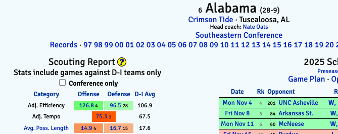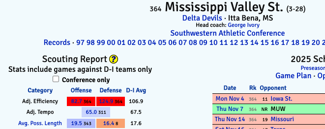 On the flipside, Mississippi Valley State had no interest in playing fast. They were bottom-25 nationally in offensive tempo, but just had no ability to stop their opponent from doing whatever they wanted with the ball in their hands.