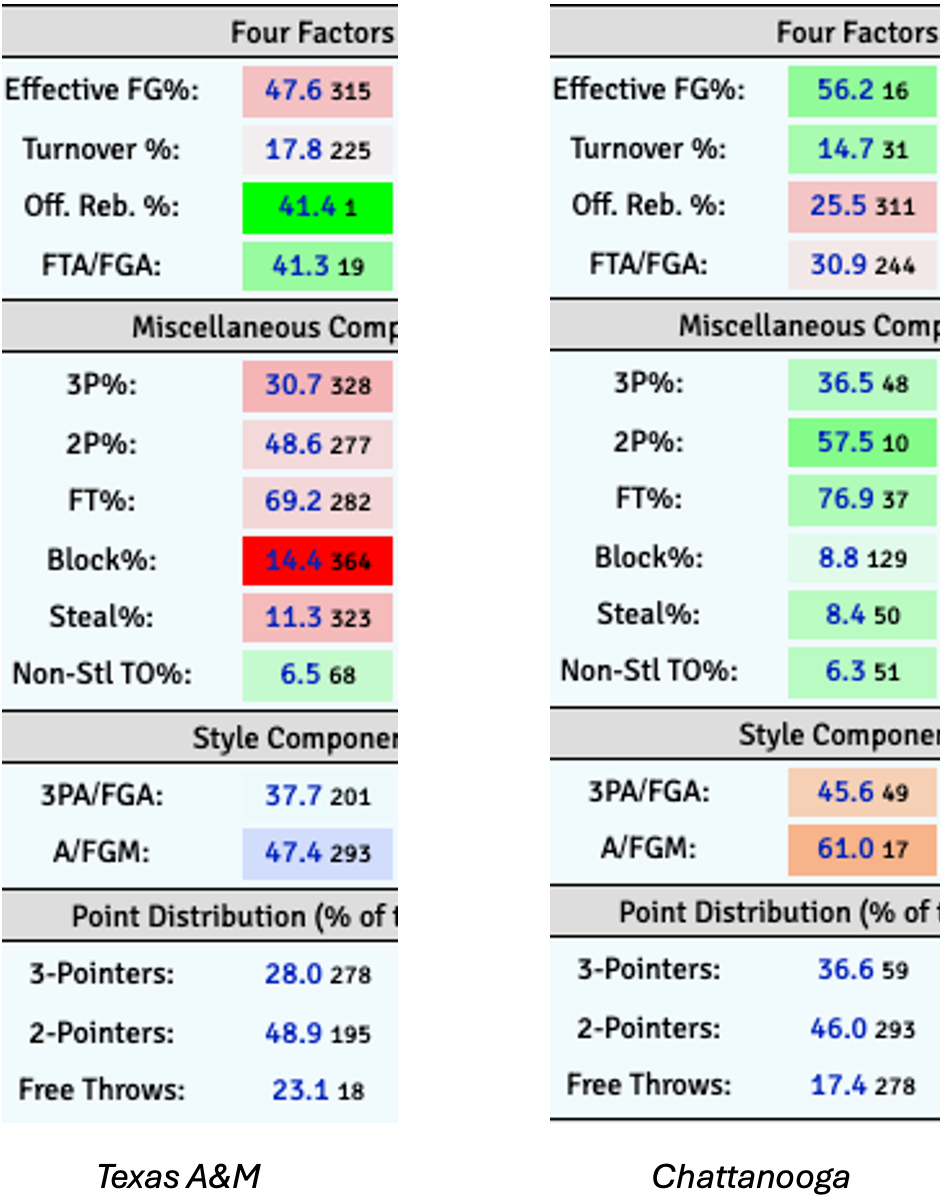 Not all offenses are created equally. But perhaps no two offenses were created more different than Texas A&M and Chattanooga. The wild part? They finished 0.1 offensive efficiency points apart, registering the exact same pace of 66.8 possessions per contest. If an opponent was set to play these two teams last year, they'd be preparing for two Top 50 offenses, but they'd have two entirely different gameplans to prepare for.