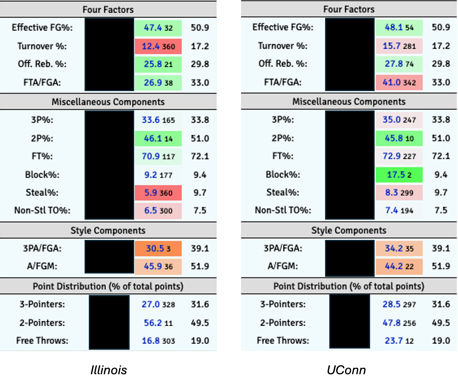 Because hedge is a lot harder to execute, you won't see too many teams implement that style. However, drop coverage has become wildly popular in the analytical era of college basketball, since it does such a good job of limiting 3-point attempts and ball movement. However, teams have chosen very different ways to defend the back end of a drop. To demonstrate this and how we can decipher it through KenPom, we'll keep Illinois' profile and replace Houston with UConn.