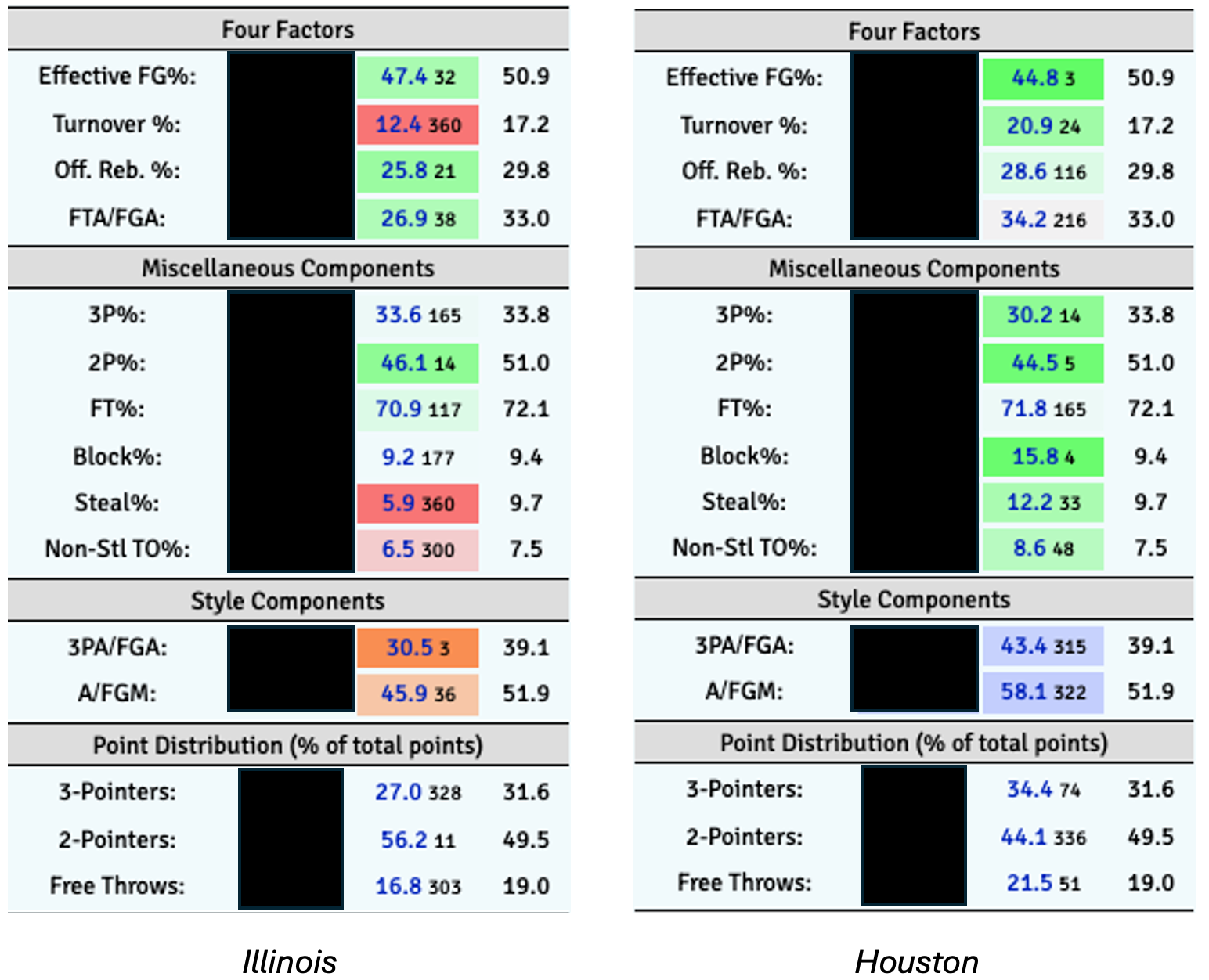 In regards to the four factors, one should assume a drop will have extremely low turnover rate because of the lack of pressure, and very strong defensive rebounding rate because the big man is usually in excellent position parked in the key. To the contrary, hedges are going to forces tons of turnovers because of on-ball pressure, and allow more second chances because of scrambled positioning after all the switches. It's no surprise that Illinois is 360th in turnover rate and 21st in defensive rebounding, while Houston is 24th in turnover rate and 116th in defensive rebounding.