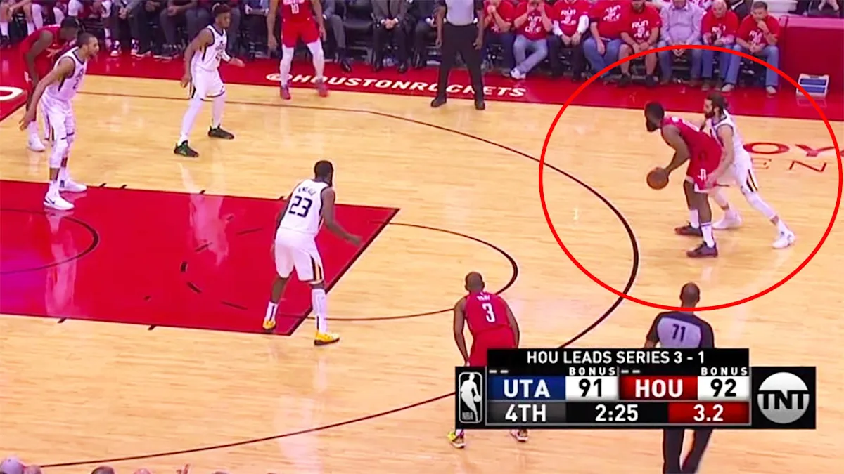 The reason we know this is simple. Like in the Swain against Illinois clip, strict drop coverages want to allow dribble attempts inside the 3-point line, so they'll funnel ball handlers to exactly where they want them to go. This both dissuades 3-point attempts and passes at the same time. The most extreme example of this was how the Utah Jazz defended prime James Harden with poor perimeter defender Ricky Rubio and excellent rim protector Rudy Gobert. (No one has done this in college basketball, at least yet).