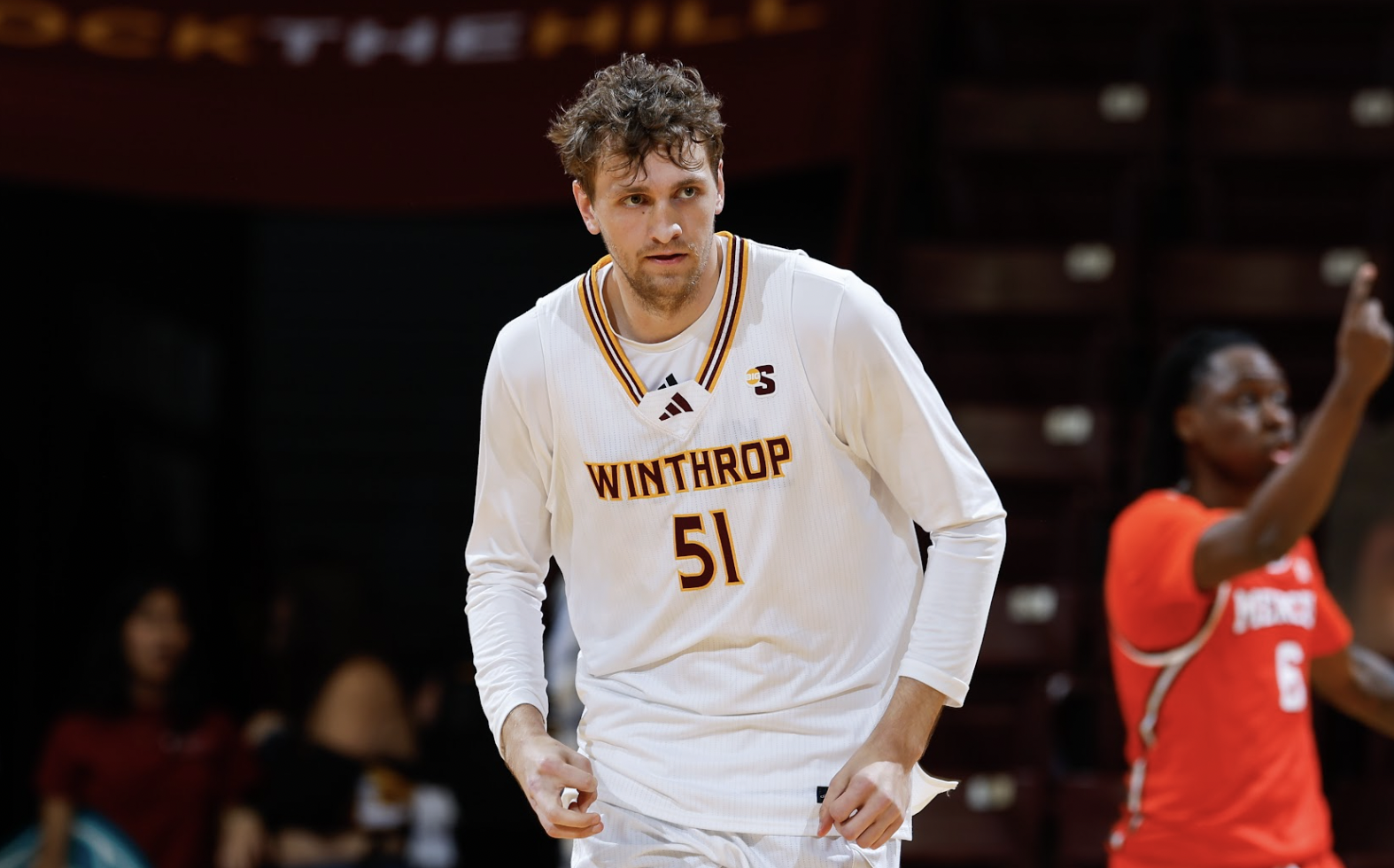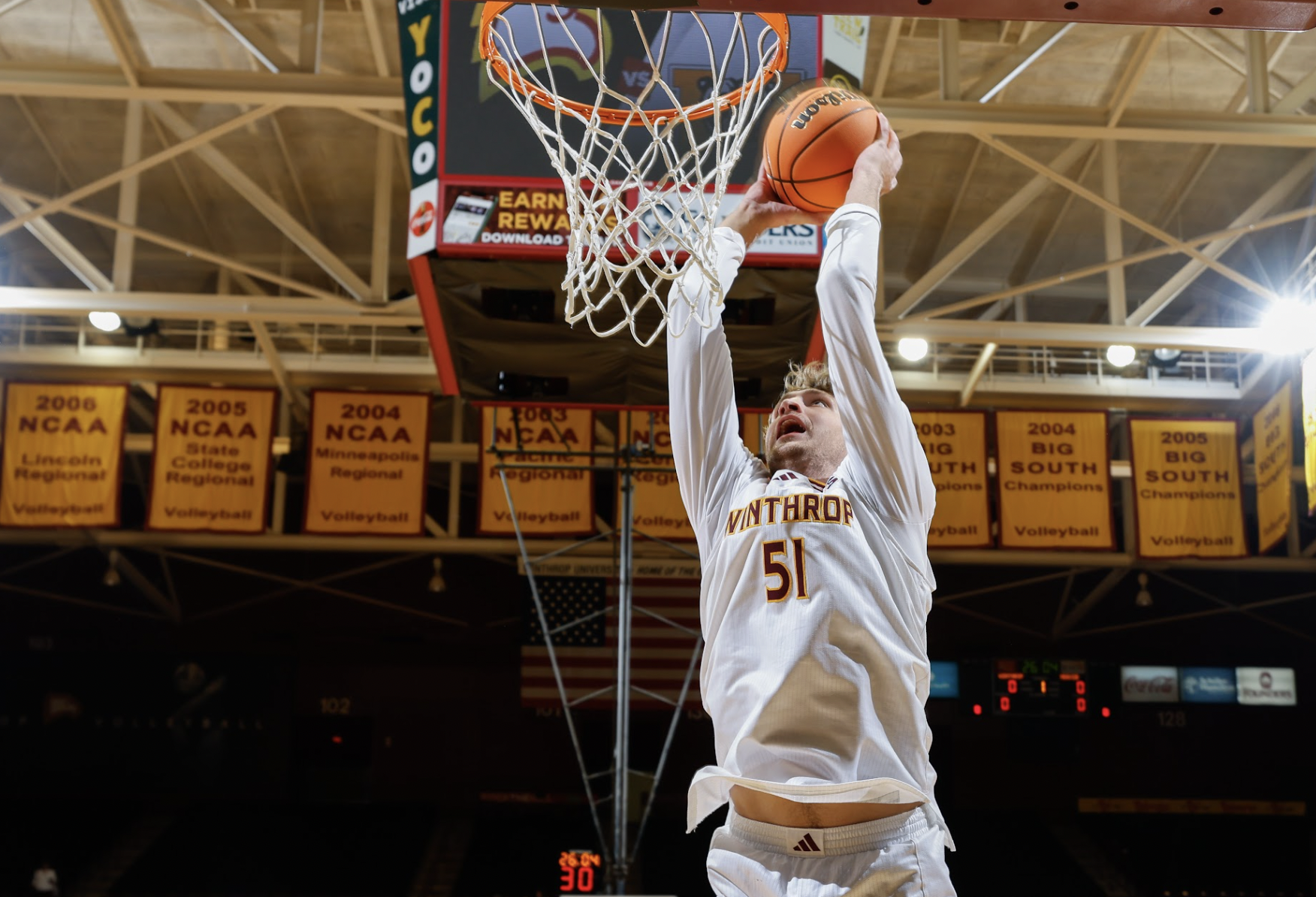 The white long-sleeve shirt that covers Duncomb’s arms and his 6-foot-10 frame makes him stand out as he trots up and down the floor between two black baselines labeled “Rock The Hill” at Winthrop Coliseum in Rock Hill, South Carolina. If the look wasn’t jarring enough, Duncomb’s 21-point double-double in which he went 7-for-8 from the field made him the unmistakable star of the show in Winthrop’s first Big South win.
