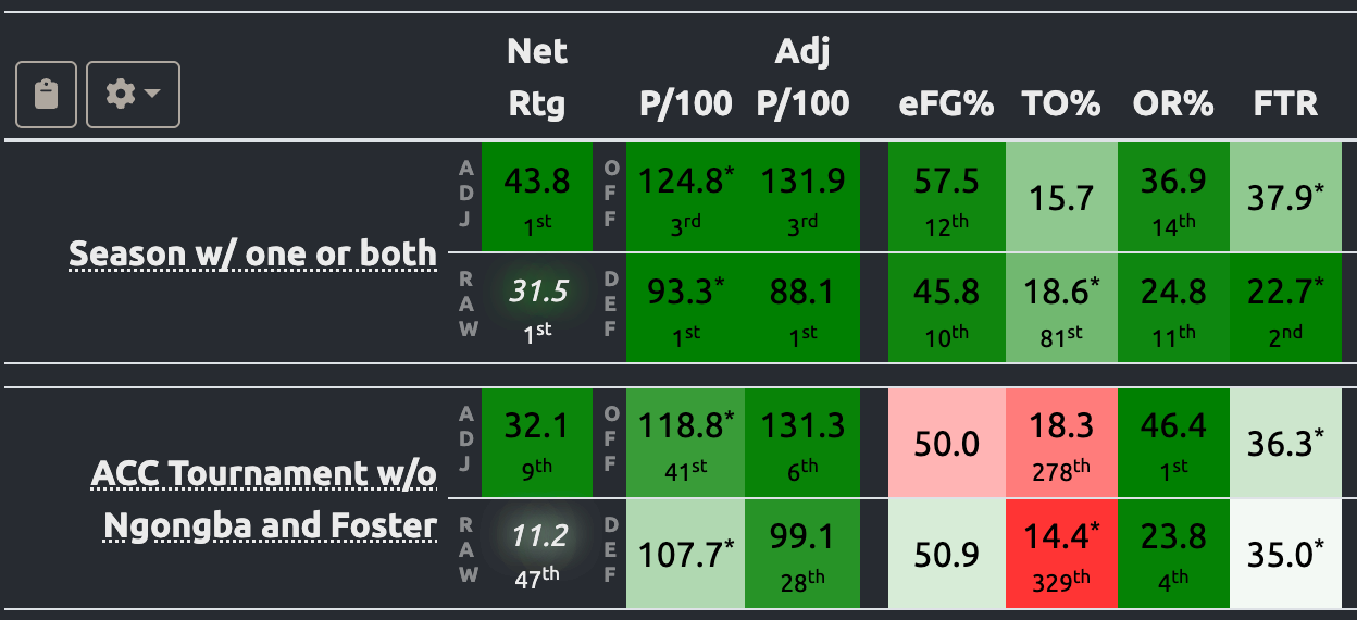 Duke enters the NCAA Tournament as the No. 1 overall seed, and the second-most powerful No. 1 seed by Tournament Index standards over the last 13 fields. It isn't completely healthy, though. The Blue Devils played the entire ACC Tournament without Caleb Foster and Patrick Ngongba. Granted, it still won the event but it had a pair of close calls against Florida State and Virginia. Assuming both remain out, here are Duke's numbers with and without the duo: