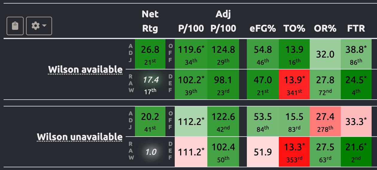 North Carolina will be without Caleb Wilson for the NCAA Tournament, but that isn't new, either. Wilson has been out since Feb. 14, so there are eight games of data and film from which to analyze who the Tar Heels are without him. From a numbers standpoint, UNC has looked like this without him: