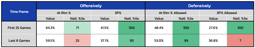 From a play style standpoint, Saint Louis is as analytically-friendly of an offense as there is in the country. The Billikens rate in the 100th percentile for rim+3s rate, attempting 87.2% of their total shots from those areas. That hasn't changed down the stretch, either. The difference is a drastic downturn in at-the-rim offense and 3-point defense:
