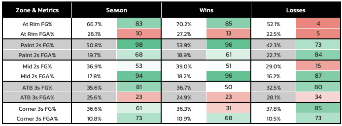 Michigan State's emphasis on 2-point scoring is not as strong as in other years under Tom Izzo, but it is still pronounced. For the season, the Spartans are 20-0 when they shoot over 50% on 2-pointers and 5-7 when failing to do so; two of their four wins when falling short of that mark were against KenPom sub-100 opponents in Colgate and Penn State. Diving into that a little bit further, the main drop-offs in wins vs. losses are at-the-rim and on mid-range jumpers: