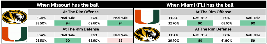 For instance, on possessions when the Hurricanes take care of the rock, they should have an advantage on the glass. Miami ranks 17th nationally in offensive rebounding rate, while Missouri is just 220th in defensive rebounding rate.