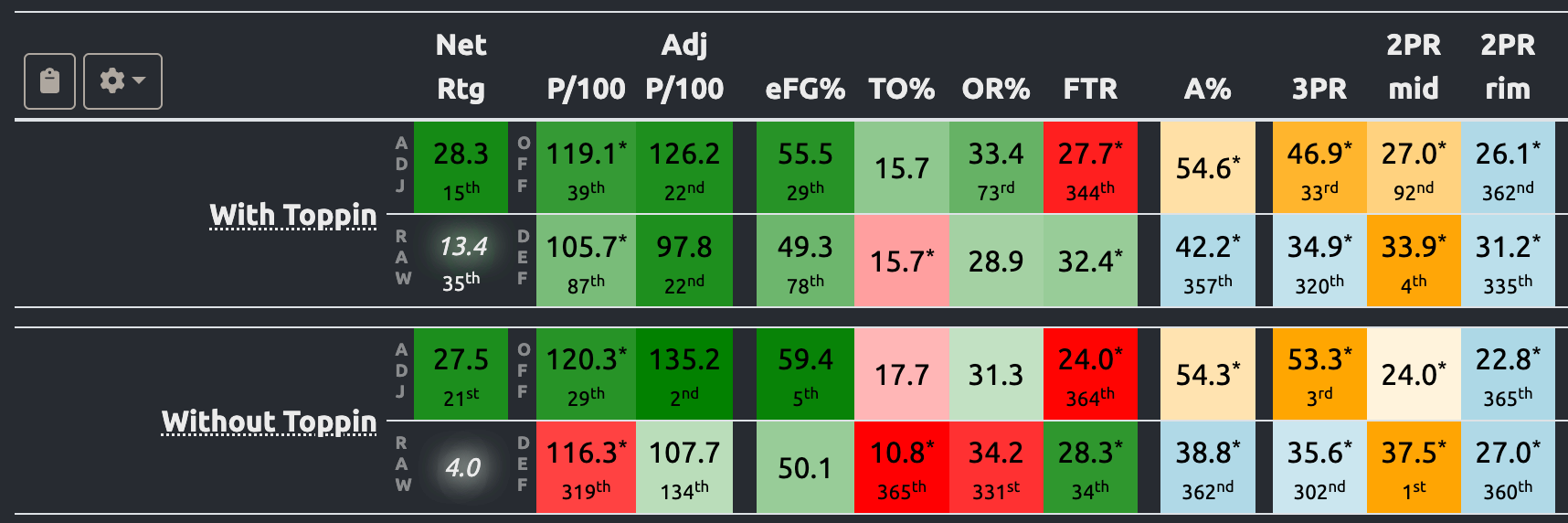 Buoyed by its nine-point road at Iowa State, Texas Tech's adjusted efficiency margin has not changed much without JT Toppin. It is on a three-game losing streak, though, and the style of play has seen a shift without the All-American: