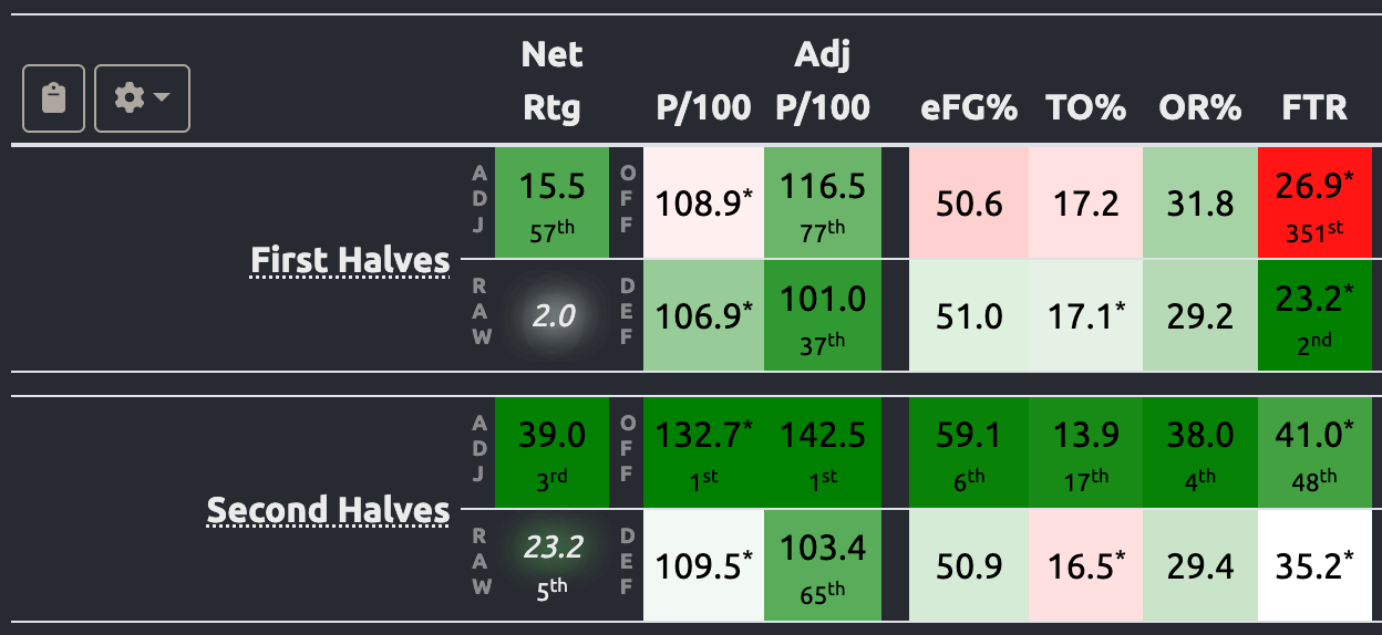 For comparison sake, Texas is also better in second halves but to a lesser degree (equivalent to No. 54 before halftime, No. 24 after halftime). Both are elite second-half offensive teams.