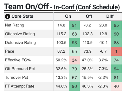 Perhaps my favorite stat of the entire region: since Dunning entered the starting five for good (11 games), he's taken 22 combined field goals and free throws, and picked up 39 combined steals and blocks. I have truly never heard of that. Prairie View has allowed 70 points or fewer in 9 of the 16 games Dunning has started, and in just two of the 15 he didn't. That is how you get on/offs that look like this.