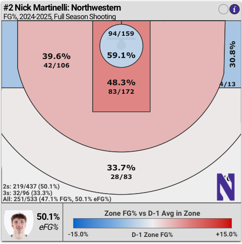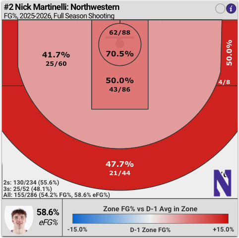 We'll start with the three point shooting, as that's the first thing that'll jump off the page when comparing stats year to year. Martinelli shot 33.3% from three last year on 2.9 attempts a game. This year that's up to 48.1% on 2.7 attempts a game. It's not the focal part of his game at all, but he's developed the jumper into a legitimate weapon. It's not necessarily that Northwestern is getting him better looks from three, he simply is just making a lot more of them. On the season, Martinelli is shooting 12/27 (44.4%) on contested catch and shoot threes, and he's 12/20 (60.0%) on open catch and shoot threes. He's getting about the same quality of looks as last season, he just now has become one of the more efficient shooters in the country (on low volume).