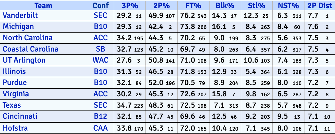 As for what’s led to this defensive resurgence, Hofstra head coach Speedy Claxton is relying on that rebounding advantage which stems from keeping opponents away from the rim. Using Ken Pomeroy’s handy new stat, we can see that the average two-pointer attempted by a Hofstra opponent this season comes from over seven feet out. That number ranks 11th in the nation.