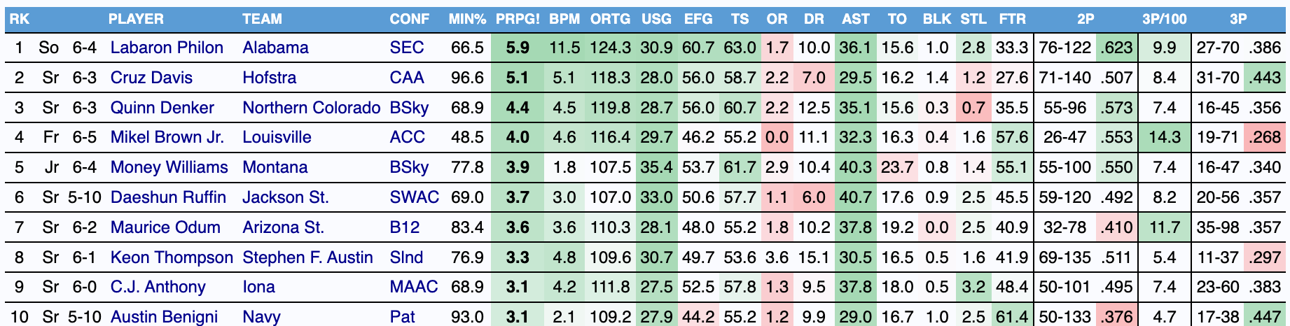 The list of players nationally with a PRPG! above 3.0, a usage rate >27.5 and an assist percentage >29 is a small one that includes some of the best guards in the country. Benigni’s recent play has welcomed him into the club of players who boast both pure talent and selfless instincts.