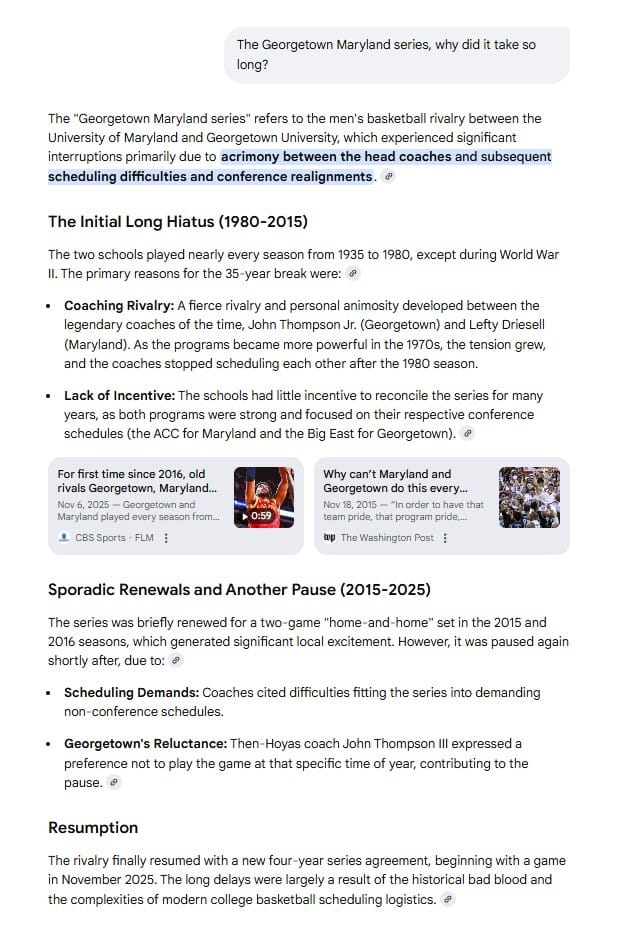 Maryland is still building an identity under Buzz Williams. A lot can be made of the timing of this game favoring Georgetown. Given the history of the series and the history of Georgetown not being near an at-large discussion, this is still very much a worthy honor for the program.