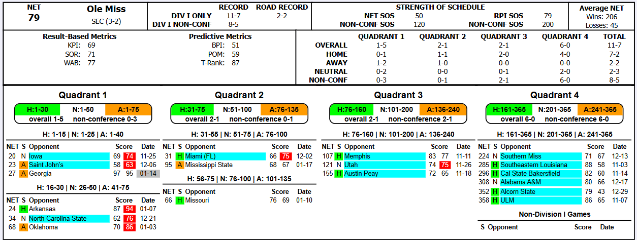 Resume Outlook: This squad barely had a pulse before the week started. Now with a Q1 tourney-level road win and a solid Q2A road win in hand, the Rebels have hope. Those are their two best wins of the season to date. Plenty of SEC chances are coming, and with deeper defined roles becoming clearer, they could really get it rolling. As of now, well out of the projected field with a 5-7 record in games not in Q4. Need to get to .500 there and add a few more tourney-caliber W's to truly flip their fate.