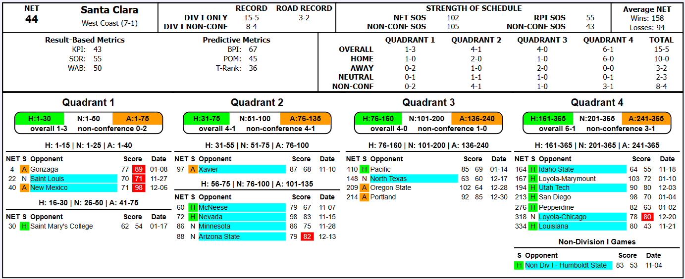 It's a fresh morning in Santa Clara! The win, as you can see above in the resume chart, gets the Broncos into the Quad 1 win column. For the long-term, though, this was gigantic to shake off the long losing streak to the Gaels and create a realistic path to 2nd Place, which has not happened for this program during the Sendek era. It would be monumental to have a bye until the Monday semifinals at the WCC tournament. The at-large picture also became more possible. The Monday AM WAB update told us that Santa Clara cracked the Top 50. It's a big if, however, SCU has the opportunity to handle business the rest of the way and slip into the Top 40 of the WAB. If so, I think the committee would likely be selecting the Broncos. Tons of "ifs" in there! But exciting to dream.