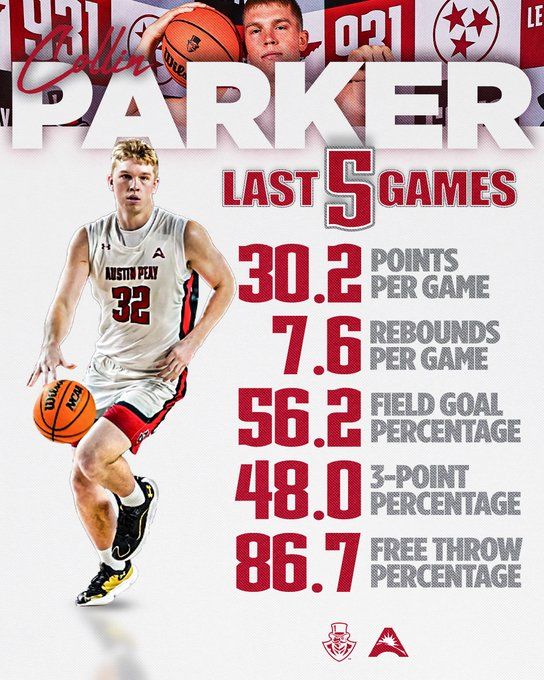 ASUN: AUSTIN PEAY - Collin Parker began his week with the highest-scoring game by a Governor in seven years, with his 39 points in addition to nine rebounds. Parker's 39-point explosion is the best by an Austin Peay Gov since Terry Taylor dropped 42 points back on February 16th, 2019. It goes down as the most points scored by any ASUN player all season long. Parker and the Govs achieved all of this while in Charlotte for a key clash at Queens. The win was critical for the ASUN race, which the Govs have control of. The Royals had no answers for Parker. Governors then picked on Bellarmine a bit as well, blowing out the Knights. Parker extended his 20-point scoring streak to a record six games by pouring in 22 points. Austin Peay is now a remarkable 13-1 in ASUN play.