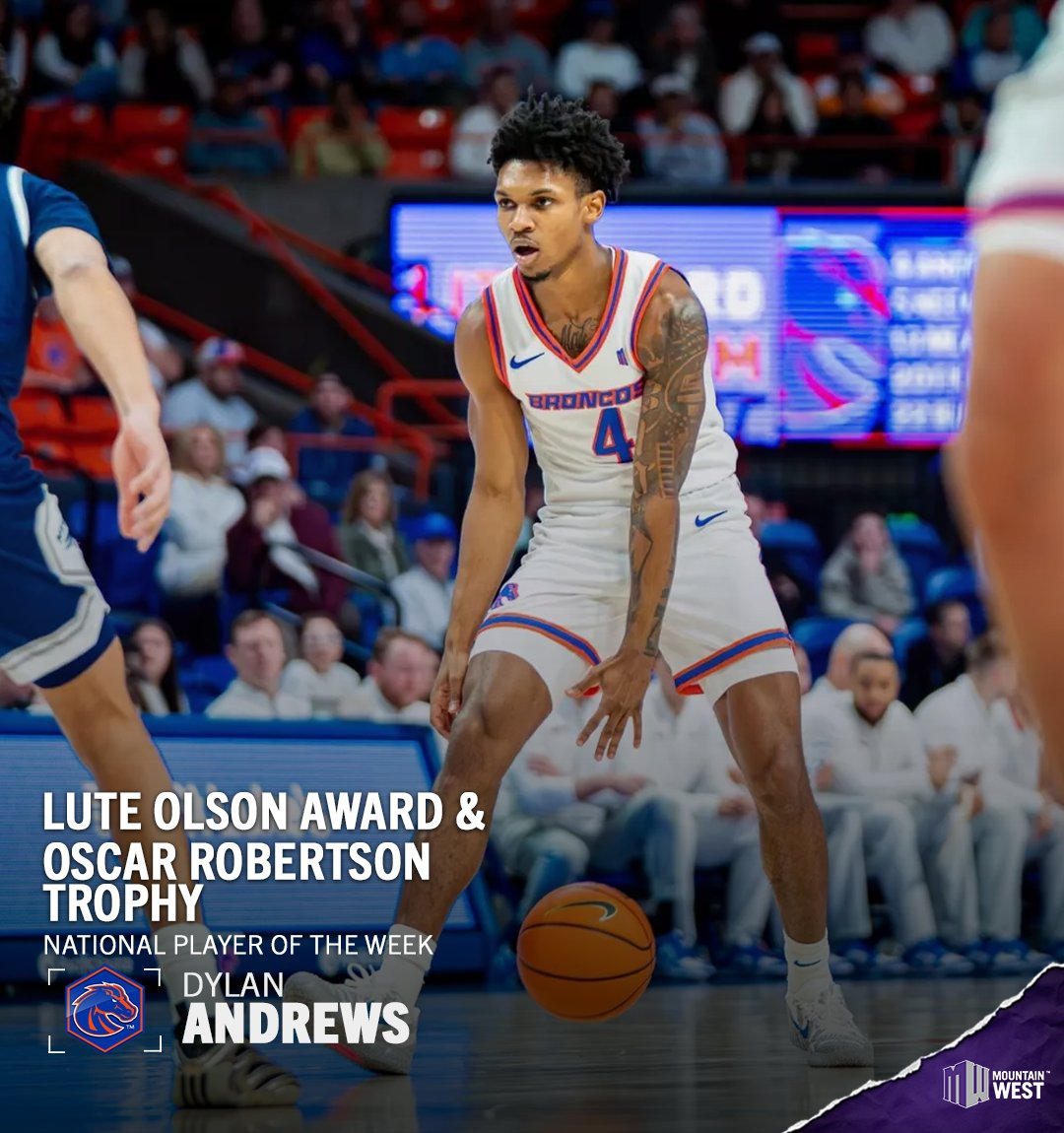 BOISE STATE - Broncos are slowly making their way back into the bubble picture, appearing as the eighth team out today. That is largely due to great recent play and some early non-conference success. The Broncos edged out Nevada at home in OT to begin the week. Dylan Andrews has been playing like a Player of the Year candidate of late. He was nationally recognized elsewhere as of Monday. The main reason? A dominant performance at the Pit, to inflict harm on the Lobo's tournament hopes. After scoring 25 against Nevada, he raised the bar further in Albuquerque, dropping 33 points and going a perfect 10-10 from the line. Boise left New Mexico with a 91-90 win, holding off a late Lobo rally.